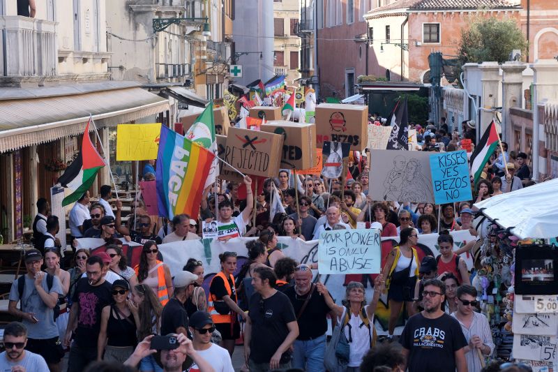 Multiple flags were visible among the protesters: Palestinian flags, pride flags, anti-fascist flags and Venice’s fimbriated red standard were among the popular choices. A few individuals waved a modified version, the sword-bearing golden lion at its hoist wearing a black balaclava.