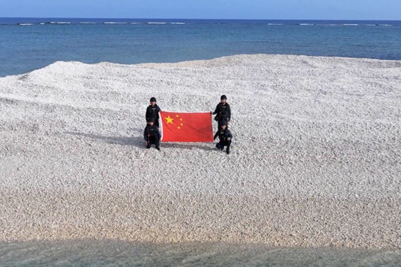 A photo aired on China’s state broadcaster Saturday showed four Chinese officers in black uniforms walking along the white sandbar as a fifth officer held an inflatable boat by the water. Another photo showed four officers holding up a Chinese flag in what the broadcaster described as “a show of sovereignty.”